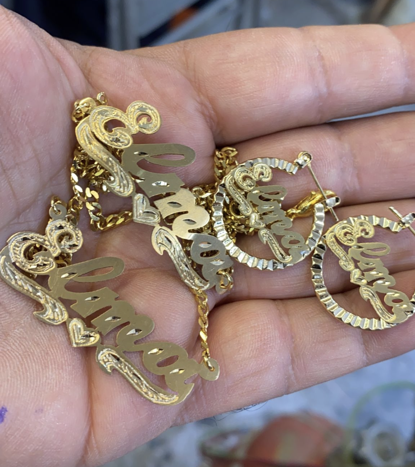 baby Personalized 14k Gold Overlay Name hoop Earrings bracelet and chain jewelry set Just spell any name up to 9 letters and we'll do the rest. Note: Only first letter will be capitalized, one name per plate. It usually takes 7-10 days for order to be delivered. Name plate is made to order and must be a final sale. . IMPORTANT! Please Spell your Name you want in the NOTE SECTION of your payment or email it after you pay Note to Customers: Since the item is hand made, the writing on the plate maybe slightly different than the picture,and also we are not responsible if gold plated item tarnished after purchasing (please try not to make it wet, it will last long)3-this item is not real gold make sure you understand. Our goal is to provide buyers with "Five Star" quality products at a fraction of retail prices. We do this by buying products on a large volume basis direct from the manufacturer. Therefore, it allows us to offer quality products at great prices, to you, the consumer! We pride ourselves in customer service. Please feel free to contact us today and Thank You for choosing us