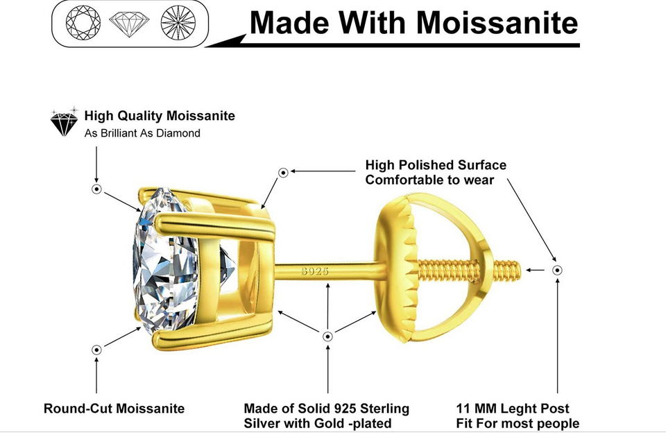 Certified D - VVS1 Moissanite Solitaire Stud Earrings Screw back gold