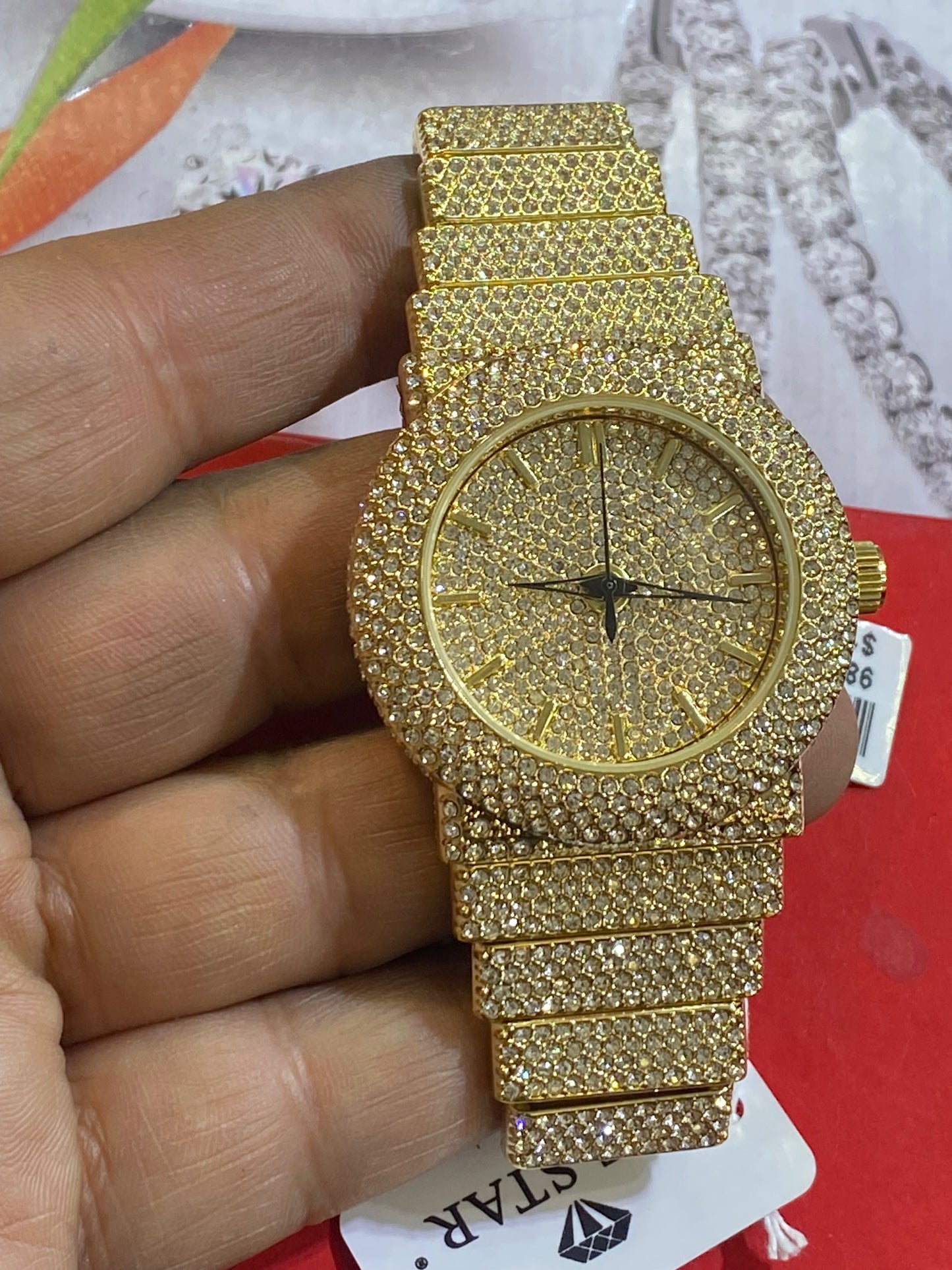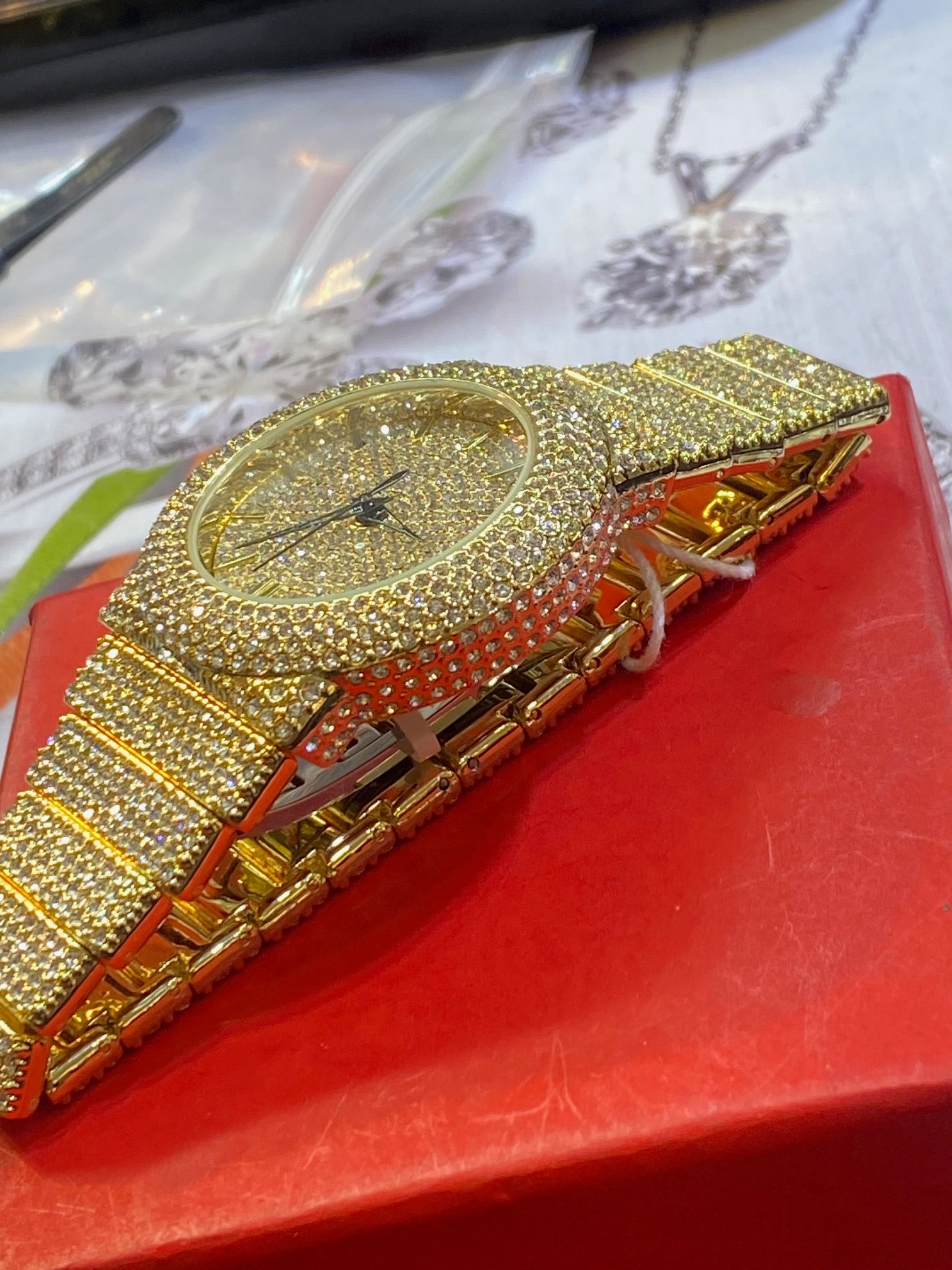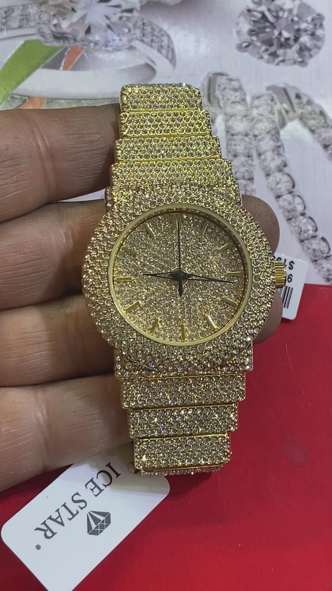 The Men round Big Face Iced up Bezel CZ gold tone bling hip hop Watch is a stylish and eye-catching timepiece. With its large round face and sparkling CZ gold tone details, it exudes confidence and boldness. Perfect for adding a touch of bling to any outfit, this watch is sure to make a statement.