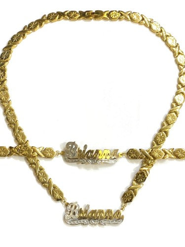 Show your love in a stylish and unique way with our Personalized 3D Double Plate Name Necklace and Bracelet Set. This custom jewelry set is crafted with intricate detail, featuring two 3D plates made from 18K gold plated stainless steel and an xoxo chain for a touch of shine. A beautiful and meaningful addition to any jewelry collection.