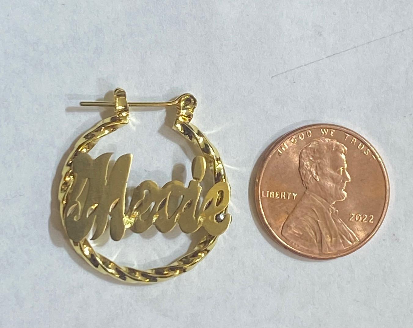 gold plated personalized baby hoop name earrings twisty 3/4"Just spell any name up to 9 letters and we'll do the rest. Note: Only first letter will be capitalized, one name per plate. It usually takes 7-10 days for order to be delivered. Name plate is made to order and must be a final sale. Gold plated bamboo name earring. Diameter: (3/4 Inch) Approx. Thickness: 6mm Weight (Name and Earring):11g Approx. Name Thickness: 0.3mm IMPORTANT! Please Spell your Name you want in the NOTE SECTION of your payment We offer you FREE Beautiful Gift Box for everyone who orders.