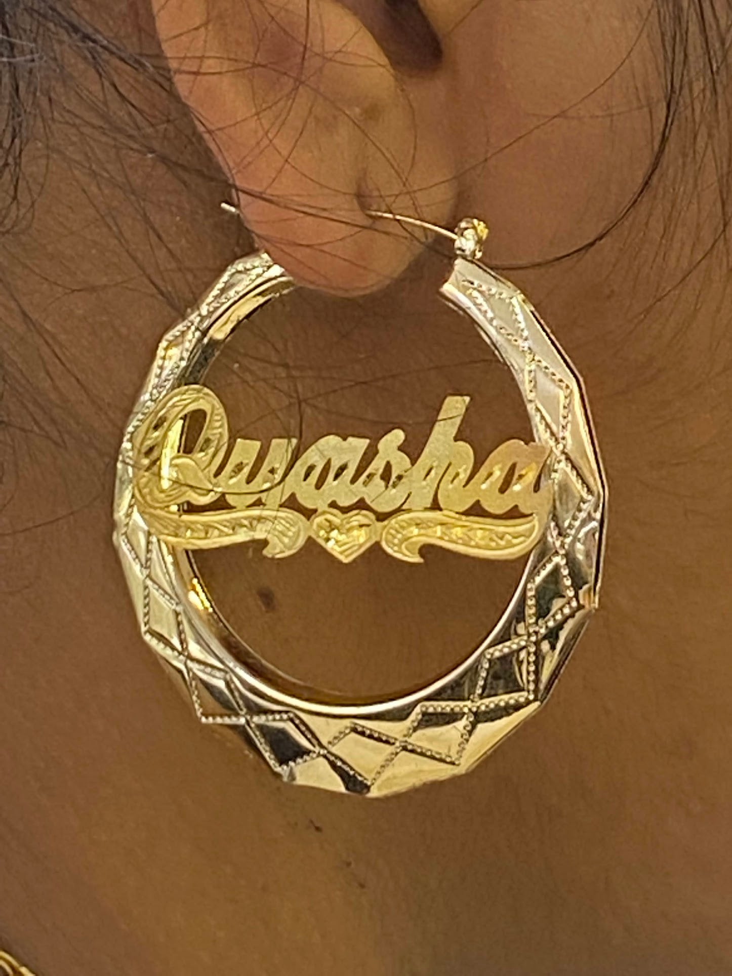 gold plated bamboo name earring with pave script letters . Just spell any name up to 9 letters and we'll do the rest. Note: Only first letter will be capitalized, one name per plate. It usually takes 7-10 days for order to be delivered. Name plate is made to order and must be a final sale.