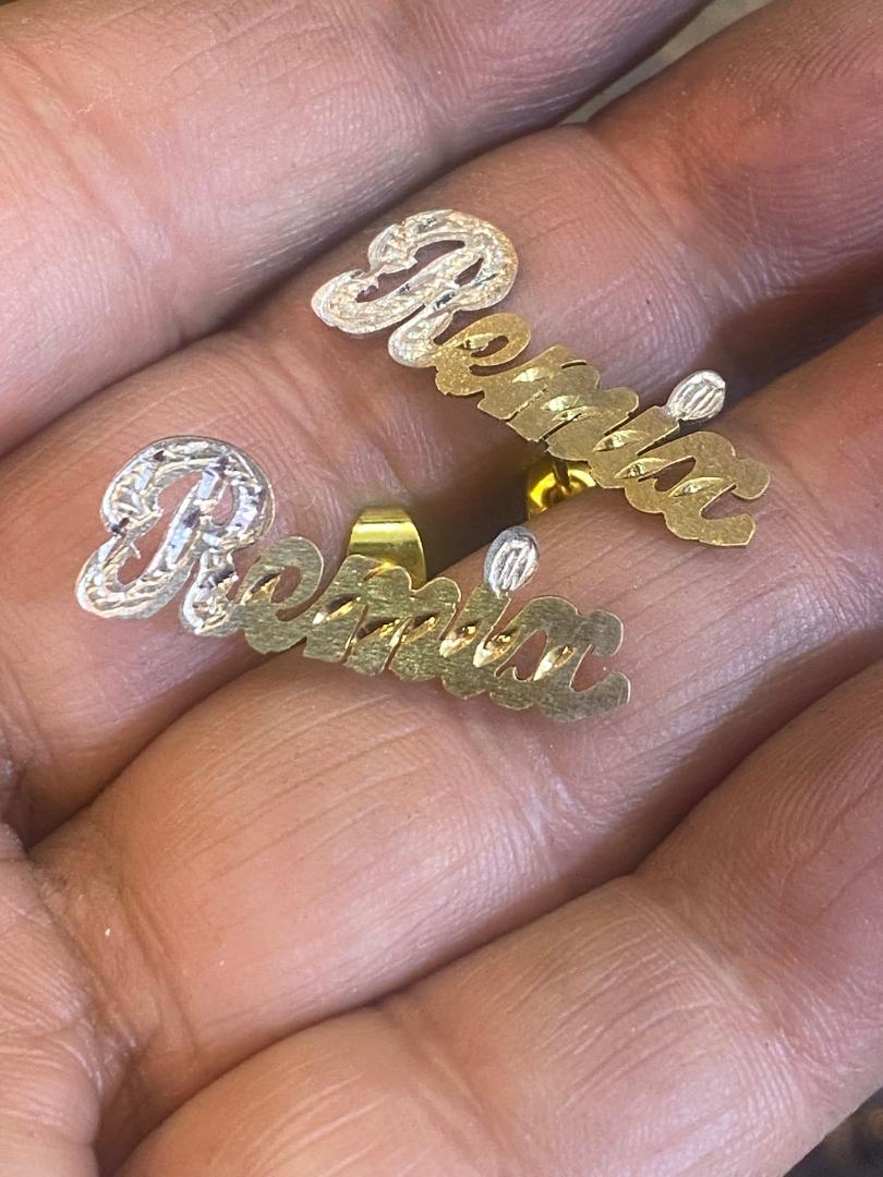 These personalized name stud earrings without a tail are a unique and elegant way to showcase your individuality. Made with high-quality materials and expert craftsmanship, these earrings are a stylish and personalized addition to any outfit. Create a statement with your name or a loved one's and express yourself in a subtle yet fashionable way.