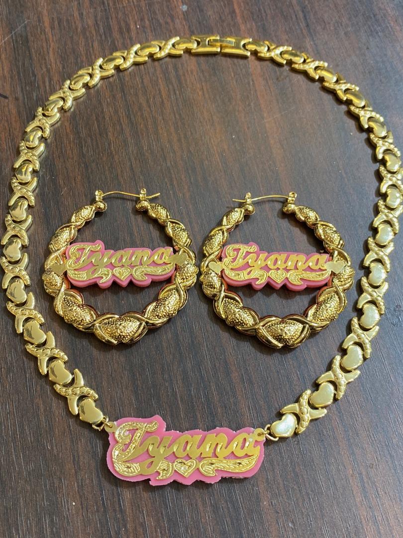Personalized xoxo heart Name Necklace and earring set with onyx